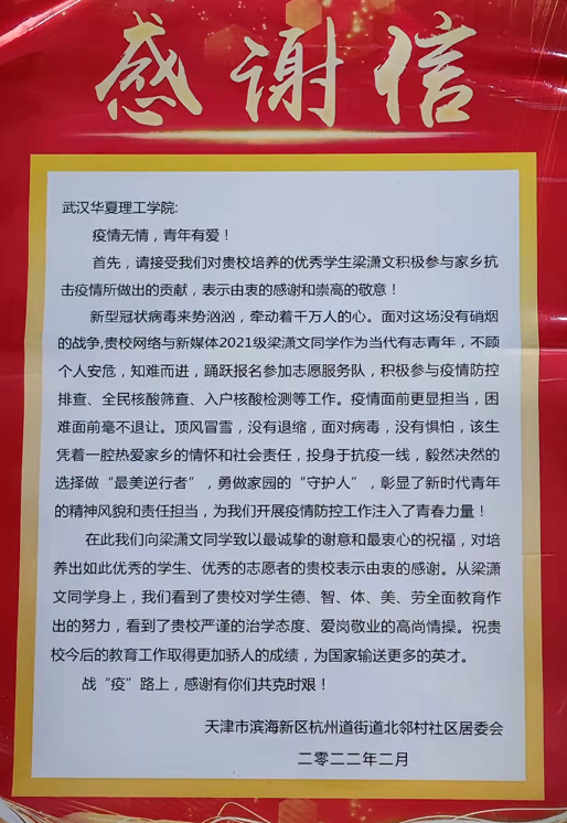 2022年1月12日,随着天津疫情防控形势的严峻,刚放假回家的梁潇文同学,积极响应社区号召,投身社区疫情防控工作。她积极参与全面核酸筛查、入户排查等工作,知难而进,不畏病毒。感谢信中这样写到“该生凭着一腔热爱家乡的情怀和社会责任,投身于疫情一线,毅然决然的选择做’最美逆行者’”。