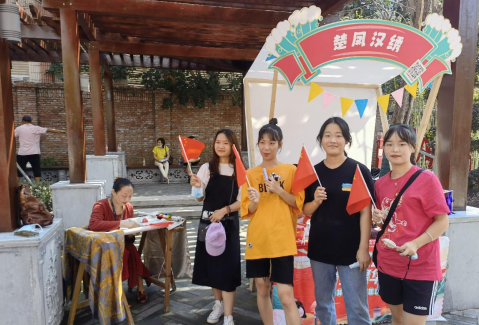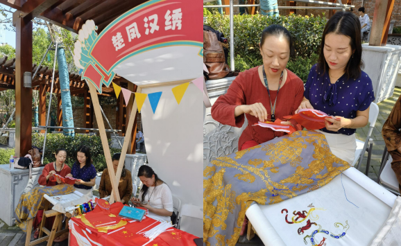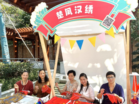 国庆期间,武汉华夏理工学院教师蒋樱和彭笛,在武昌昙昙华林汉绣博物馆附近,义务参与汉绣非遗项目“楚凤汉绣”的非遗公益活动。