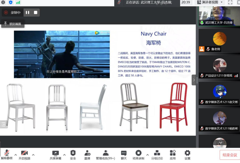 吕教授为本次讲座进行了充分地准备,案例丰富,包括为主题整理的图片、视频资料等,内容饱满。吕教授以“学好设计最重要的是什么?”问题开场,在电影《阿凡达》场景中出现的海军椅(Navy Chair),对其设计造型、设计解决的问题、设计的目的和意义进行阐释,以有趣的语言让同学们了解设计作品背后的故事。著名的巴塞罗那椅也出现在多部电影作品中,《007:大战皇家赌场》、《蝙蝠侠大战超人:正义黎明》等电影中均能看到该椅子的场景,因其是现代主义设计最负盛名的代表作之一,也是世博会德国馆密斯的代表作,具有时代性,成为了现代家具设计中具有里程碑意义的作品。吕教授提到,学设计的同学要具有专业的敏感性和探索精神。在观影过程中,学生不仅可以欣赏和体味电影情节故事,也可以从中发现有趣的设计作品,结合平时课程的学习,会对所学专业有更深刻的认知,启发设计创意和创新精神。