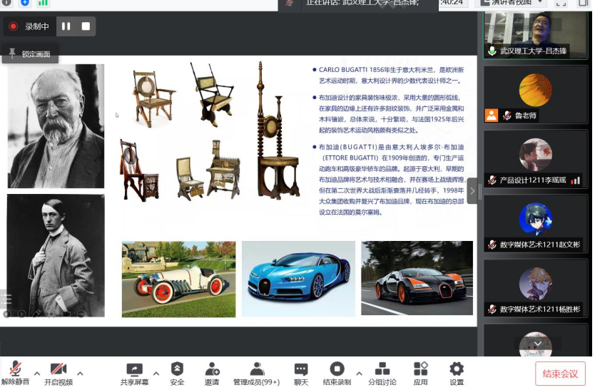 本次讲座由产品系教师鲁黎黎老师主持,对讲座嘉宾进行介绍,并对讲座开展的重要性、学习意义等进行说明。吕杰锋,教授,清华大学设计学博士,现任武汉理工大学艺术与设计学院副院长、工业设计系主任、工业设计特色专业责任教授,曾任教育部、科技部、广东省政府“科技特派员”、国家公派赴意大利米兰理工大学访问学者,兼任湖北省机械工程学会工业设计专业委员会副理事长、湖北省高等教育学会设计专业委员会副秘书长等职务。他长期从事工业设计教学、研究与实践,致力于产品设计、船舶与海洋工程领域的设计研究。武汉市工业“十三五”规划《武汉市制造业与服务业融合发展专项规划》编写等课题。