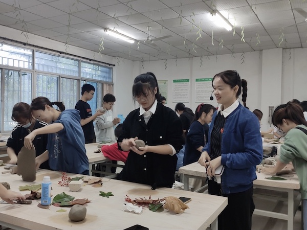 活动开始,王老师讲解了陶艺的相关知识,熏陶我国中国优秀传统文化作为中华民族的精神瑰宝,强化我校大学生的国家认同感。同时,细致讲解叶形盘制作过程及注意事项等。