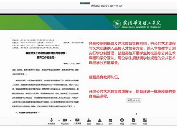 6月15日12:30,学院教学副院长李娟在腾讯视频会议主持召开了艺术设计与传媒学院美育工作启动会议。学院院长李娇、教学办主任李蓓蓓、美育教师组成员和全体实验教师共同参加了此次会议。会议就美育课程建设意义以及美育工作相关安排进行传达与沟通。