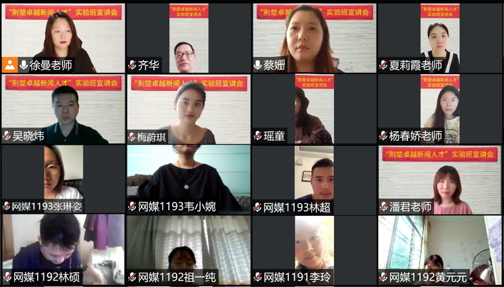 “老师,实验班培养重点是什么?”“实验班和平行班区别是什么?”“实验班和网媒工作室矛盾吗?”“实验班另外收取学费吗?”“实验班对外语有特殊要求吗?”……5月26日中午,在腾讯会议室里,一场关于网络与新媒体专业“荆楚卓越新闻人才”实验班的宣讲会如期举行,该专业2019级同学、辅导员、班导及任课老师全员参会,传媒系系主任蔡姗主讲,同学们对宣讲内容表示浓厚兴趣,现场提问踊跃。
