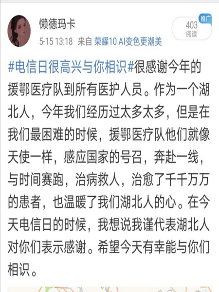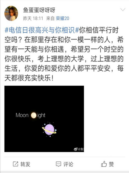 话题一经发起便得到广大网友的关注,大家纷纷点赞评论,大到家国情怀,小到个人情感,或祝福或期盼,参与度很高,收到上千条评论,其中不乏一些感动、有趣的评论。如致谢援鄂医疗队的“三行情书”,种下心愿期盼遇见更好的他的绵绵情意,游戏结识好友的相知相伴,希望平行时空的人平安喜乐的殷殷期盼,等等。通过本次线上活动,不少网友表示从来没有想过会和陌生人有这么亲近的交流,发出或者收到祝福心里感到很温暖,希望话题可以继续下去,让更多的人增进了解,传递感动。