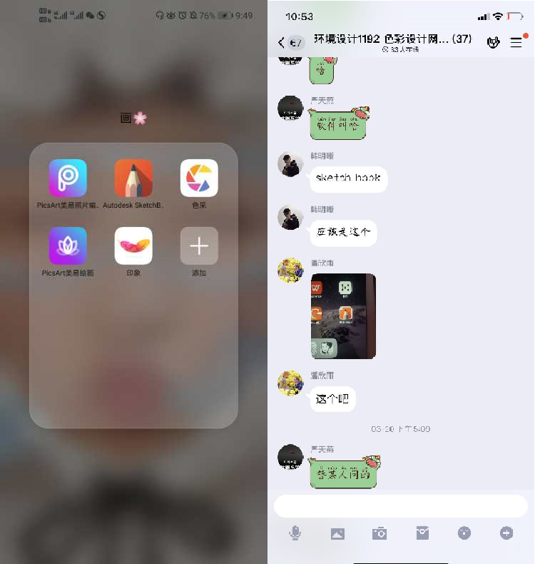 考虑到疫情期间大家大多留守家乡,身边的条件有限且大多数同学身边没有电脑。采用何种方式完成作品也成为了令老师和同学们头疼的问题。经过多方比对和筛选,最终选择了用sketchbook来完成作品。于是,各路“手残党”们利用身边有限的设备开始各显神通了。