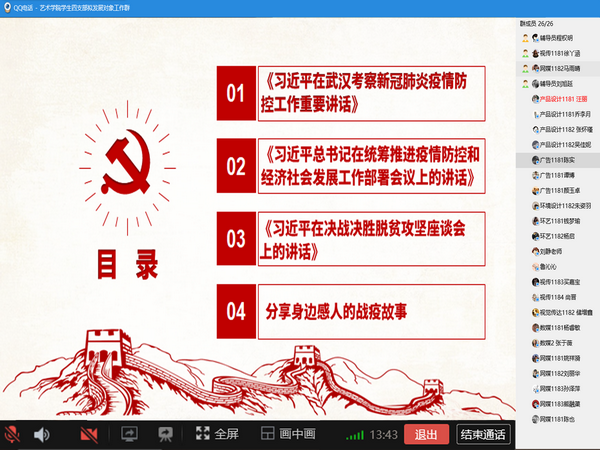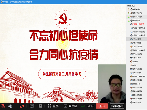 2020年3月18日,艺术设计与传媒学院学生第四党支部召开“不忘初心担使命、合力同心抗疫情”线上主题党日活动。活动由支部书记程权明主持。学生第四党支部全体成员、入党积极分子参加了此次活动。
