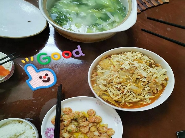 广告1191钱玉馨:鲜嫩的小青菜,油汪汪的虾仁,白菜、百叶、虾米,一顿简单的饭菜散发出的却是外面没有的家常菜香。