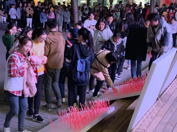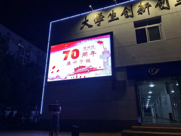 3月26号晚上8点,为庆祝新中国成立70周年,武汉华夏理工学院举办了一场浪漫而热烈的“告白活动”。一块巨大的插满红色荧光棒的泡沫墙放置于我校大学生创新创业基地前,通过华夏QQ表白墙、课间表白小纸条等悬念的制造,现场围满了前来一探究竟的老师与同学。当荧光棒被大家一根根拔下,本次表白活动的对象也正式揭晓——“I ❤ 中国”,四个火红的荧光字十分醒目。此时,特邀嘉宾沈阳音乐学院张佳荣深情演唱的《我和我的祖国》,引起了全场师生的共鸣,“我和我的祖国,一刻也不能分割,无论我走到哪里,都流出一首赞歌……”,大家激动地挥舞着手中的荧光棒,并大声地一起唱起来。当歌声停止,现场响起了热烈且经久不息的掌声。