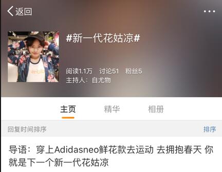 花姑凉小组,与滔搏运动旗下的阿迪达斯neo合作,推广adidasi neo 三月新品鲜花款。该小组策划了五个方案,其中线上自媒体微博方案效果意外的好,线上为adidasi neo量身定制微博话题#新一代花姑凉#,引发自媒体微博用户争相转发参与,话题阅读量很快破万,该话题成功登上生活榜热点话题。在花姑凉小组的策划下,本来销售不乐观的鲜花款一夜之间变成“爆款”,在武汉地区的库存销售一空。