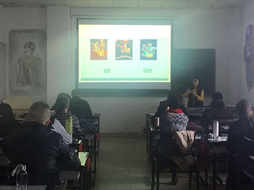 随后,邓婧老师用饱满的热情,绘声绘色地从东方与西方两面讲授了抽象思维的方式,并提出了想象力的重要性,期间表达出艺术源于生活,高于生活的主题思想。内容扣人心弦,引人入胜。紧接着的蒋娟娟老师以及姜轲老师授课都各自选了一个切入的点,做出了精彩的呈现。
