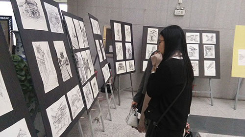 上午,会展上就陆陆续续吸引了许多老师们、同学们前来驻足观看。这些画作风格各异、引人入胜。即使是同一片风景,在画者的想象下也变得与众不同。线条粗细的勾勒,甚是精致用心,配以图片,显得更为真实生动。