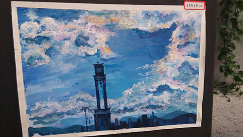 在所有画作中,有几幅尤为显眼。这些画是被挑选去参加湖北省高校美术展比赛,其中就有产设1152班叶樊、龚嫣等同学的画。谈到自己这幅作品时,龚嫣表示,在途中最喜欢那里的蓝天白云,这赋予了她无限的想象力、打开了视野,因此自己的作品对比实照也显得更为梦幻。而民宿古楼非常有当地风情,融入画作中,能凸显彩云之南的风味。