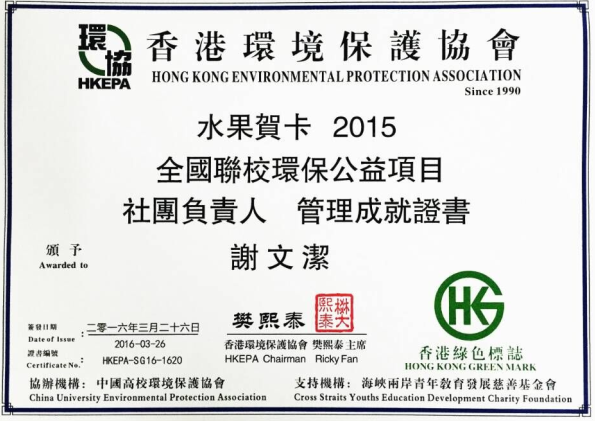 日前,我系青协荣获由香港环境保护协会颁发的《水果贺卡2015全国高校环保公益项目全国百大优秀奖》,系青协会长谢文洁获得《社团负责人管理成就证书》。