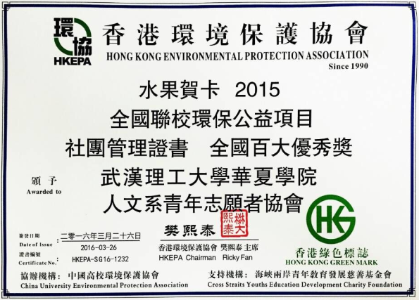 2015年12月10日,香港环境保护协会公布了《水果贺卡2015》全国高校名单,院青协、人文与艺术系青协顺利通过了向香港环境保护协会提交的申请,承办我院的《水果贺卡2015》环保公益活动。