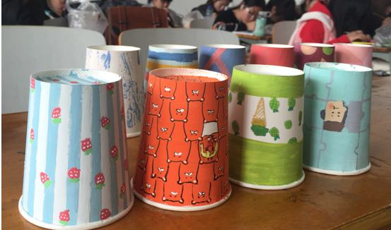 产品1151班的《二维设计基础》课程,在上一阶段的构成形式训练中,取得了很好的教学效果,也为学生带来了新概念的思考,目前该课程进行到对色彩的认识和学习的环节中,在已有构成概念的基础上融入了色彩的概念,学生们还是通过“一次性纸杯”作为载体,再一次激发了他们的设计灵感。