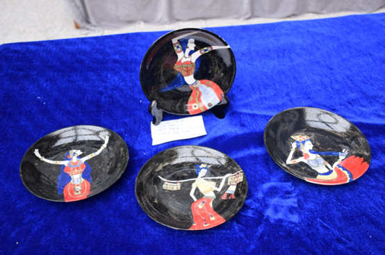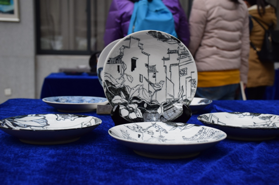 本次展览的是以古代传统工艺绘制的陶瓷艺术作品。据了解,从最初的瓷泥到成型瓷盘,需要先将瓷泥烧制到一定程度后变成素坯,再进行先画在纸上而后拓印在素坯上的绘制着色,接着再进行上釉,最后就是一整天的风干烧制。这些作品将古老的陶瓷文化与现代纹样相结合,充分的展现了我系学生的艺术创造力。