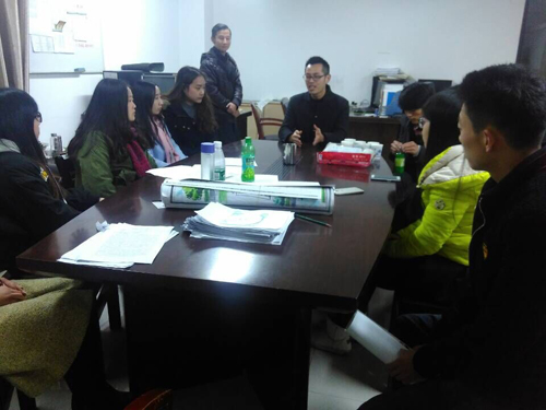 11月26日晚7时,橡树街装饰设计有限公司在综合楼1002会议室召开了一场小型招聘会。其公司总经理赵镇南、市场总监雷冰、副店长肖钦、设计师黄鑫担任招聘官。应聘的11位人员均为人文与艺术系环艺设计专业12级,13级学生。