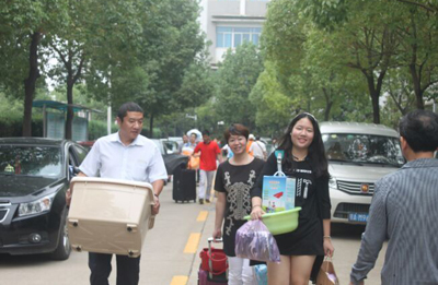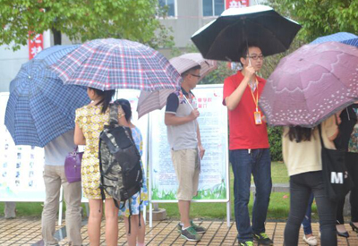 早上7时天气阴凉、伴有小雨,新生陆陆续续前来报到。志愿者们热情的招待新生,冒着雨带领他们去办理手续,帮助新生拿行李,并耐心回答新生的问题。红色的志愿者制服上分不清是汗水还是雨水。许多家长对我系志愿者赞不绝口,他们表示志愿者非常负责,不仅向他们详细的介绍了新生报到的流程还将他们带到指定地点办理手续。“虽然很累,但是我们很开心。为新生带路是我们的责任,我们会为工作负责”环境设计1141班杨艺慧说到。