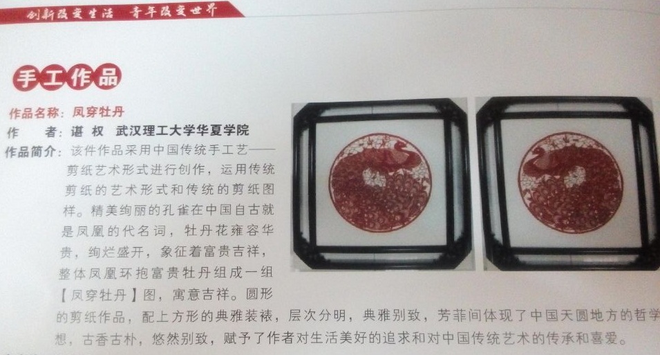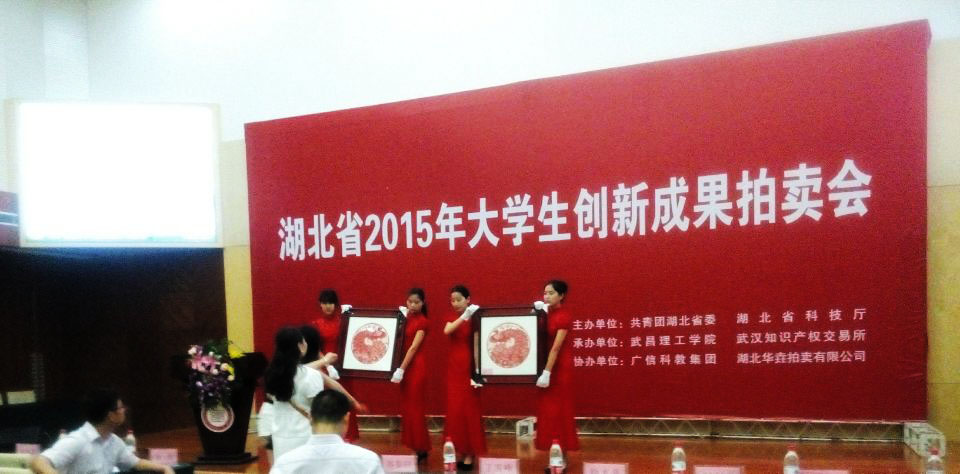 据了解此次拍卖会旨在探索和推进大学生创新成果的市场转化,帮扶大学生更好的创新和创业发展,武汉大学等34所高校49件创新成果入选拍卖,28家媒体报道84家企业公司参与竞拍。拍卖的作品形式多样,造型精美且富有内涵。其中,我院人文系学子谌权的创新成果——【江城印象】和【凤穿牡丹】工艺剪纸作品凭借精美的剪纸工艺和独特的艺术审美在此次拍卖会深受广大媒体的关注,也博得了多家企业公司及其工艺爱好者的青睐,取的较好成绩。