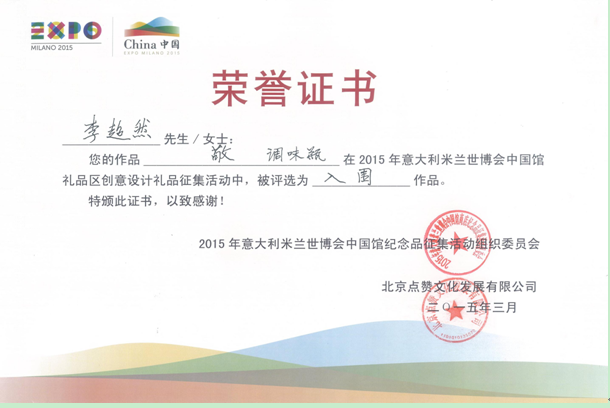2015年世博会于5月1日至10月31日在意大利米兰举办,此次世博会的主题为“给养地球,生命的能源”。中国作为本届世博会第二大自建馆国家,在此次中国馆礼品区将专门推出创意设计礼品板块。为了在世博会集中展现中国新生代创意设计群体的风采,结合世博会主题,以及礼品区“中国有‘礼’”的整体概念。以“创意‘礼’赞生活”为主题的创意设计礼品在全国进行征集,征集的设计作品范围将围绕“生活”展开,通过征集活动,选拔出有代表性的优秀文化礼品在米兰世博会进行展示、推介和销售。
