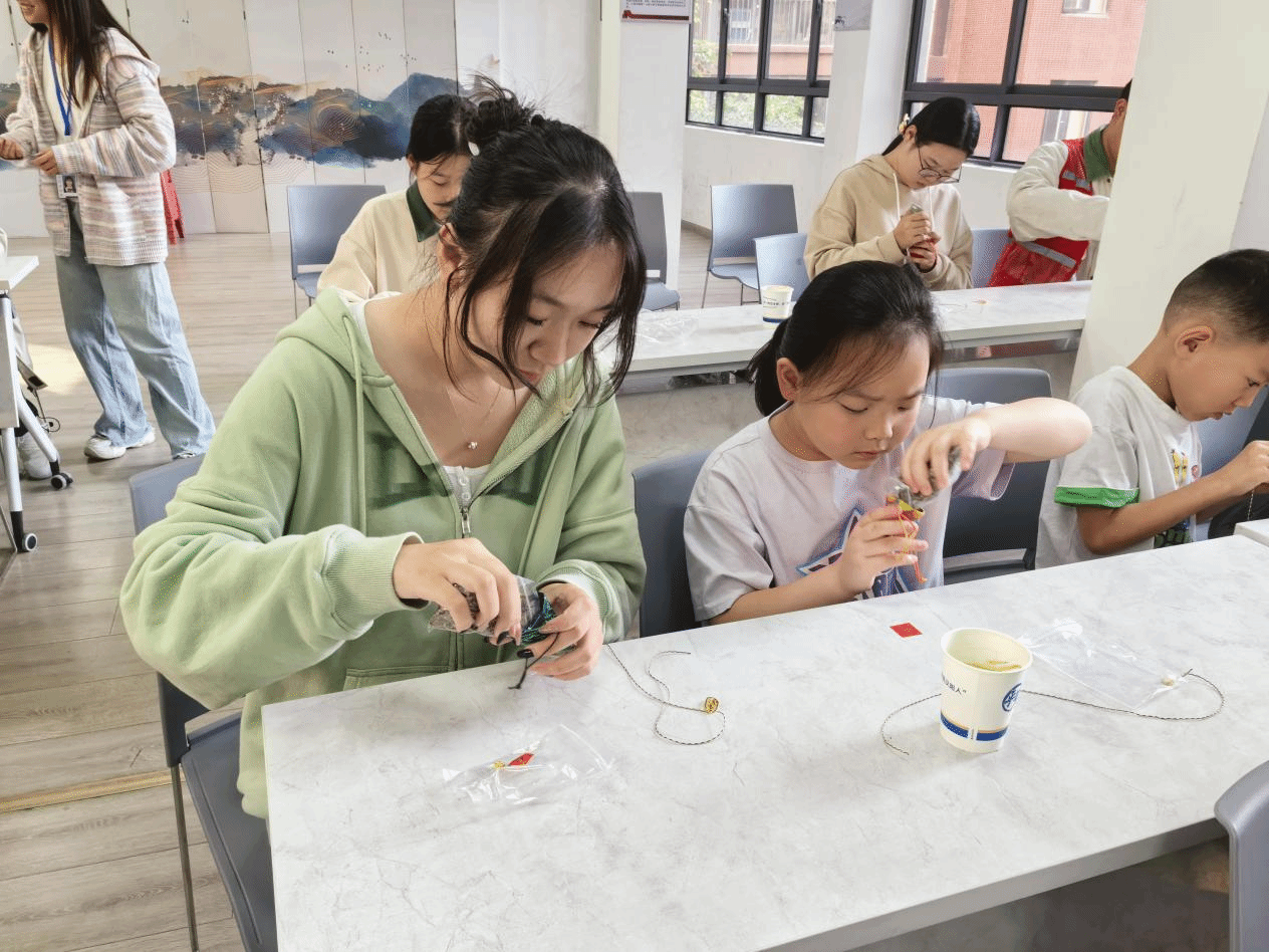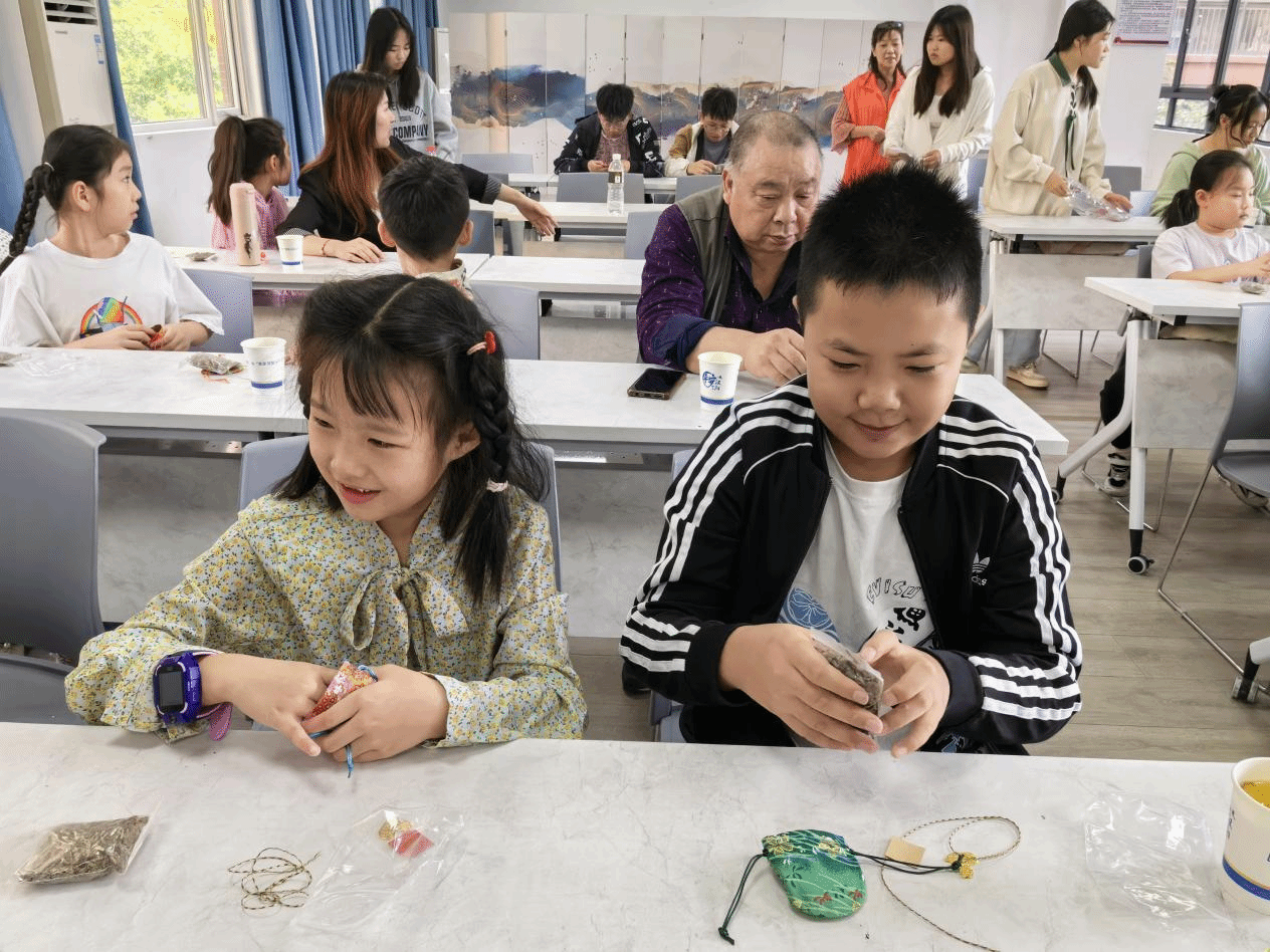 活动接近尾声,“遥知兄弟登高处,遍插茱萸少一人”, 在中国的传统文化中,茱萸被视为吉祥和幸福的象征,同时茱萸的寿命比较长,因此它也被视为长寿的象征。因此也有了茱萸香包现场制作的活动,希望将这份美好的祝福传递现场的所有人。起初,只是观察志愿者们的步骤,很少有小朋友直接学会的。因此每一位志愿者又手把手来教学小朋友们如何一步一步、有条不紊地制作香包。把分好的的材料放进每一块布料上面上下反转、结扎,一个个精致美观的香包在他们手中诞生。整个制作中,小朋友们都很开心地享受这个过程,志愿者们也都很开心地帮助这些小可爱们。亲手制作的香包更是具有心意和真挚,在此过程中切身了解到茱萸对于重阳节的作用之大以及意义之深。