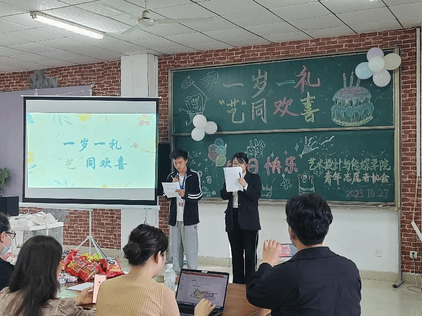2023年10月27日12点20分,艺术设计与传媒学院青年志愿者协会桃李美部在8号艺术楼832举办“一岁一礼,‘艺’同欢喜”的主题生日会,艺术设计与传媒学院的视觉传达1235班导师班主任王东篱、视觉传达1221导师班主任杨婷婷、视觉传达1215导师班主任焦洁、环境设计1231导师班主任柯鑫、网络与新媒体1231导师班主任刘馨开、视觉传达1203导师班主任许莉、产品设计1221导师班主任朱琦、团总支书记陈军老师受邀出席此次生日会,与近期过生日的大一新生共同庆生。