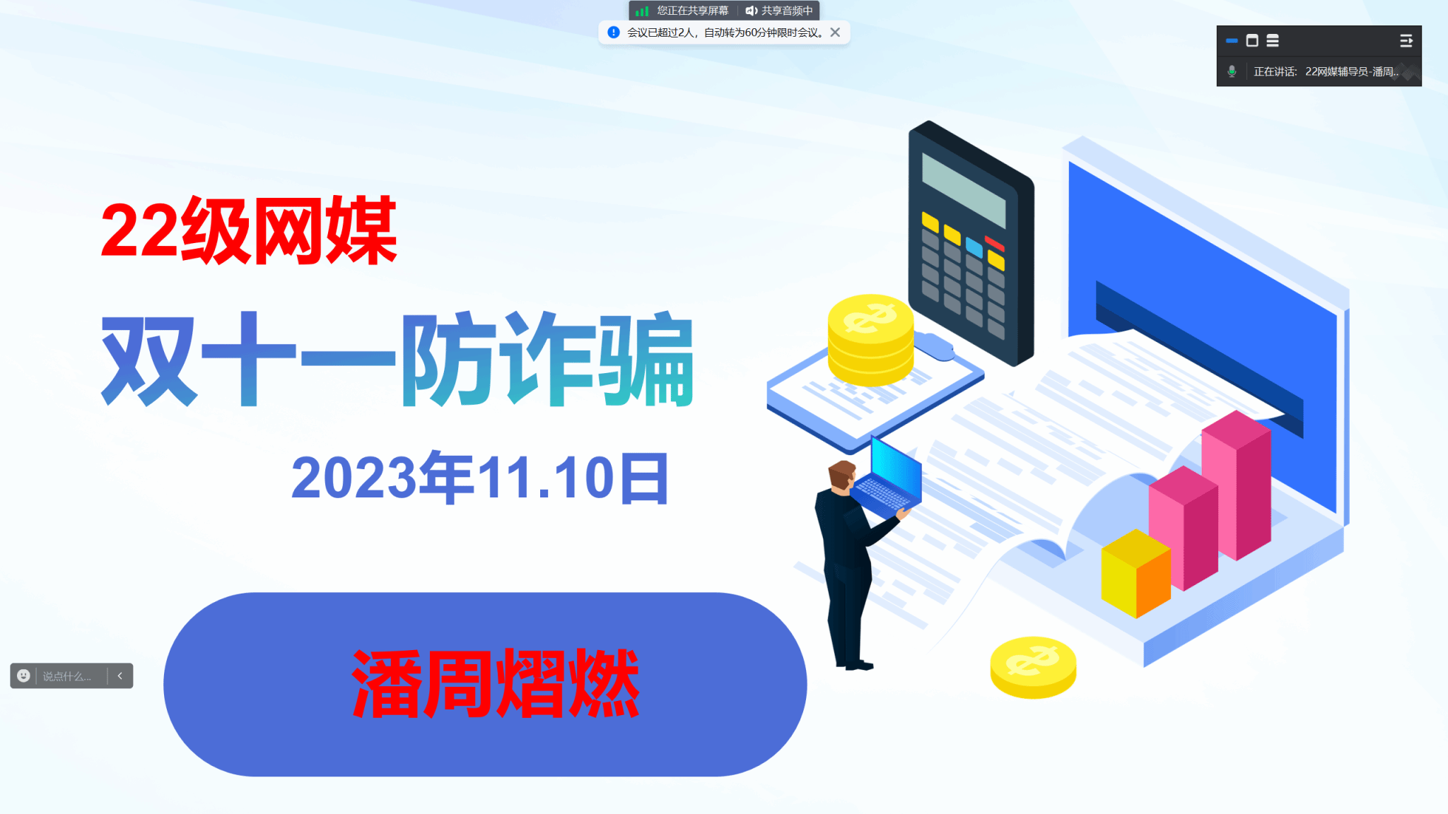 近年来,随着科技的发展和互联网的普及,双十一购物狂欢节已成为全国范围内的一项盛大活动。然而,在享受购物狂欢的同时,我们不能忽视了一个重要的问题——诈骗。特别是在大学校园内,双十一期间的诈骗风险更是需要引起我们足够的重视。为了切实提高大学生的防诈骗意识,保障校园的安全稳定,22级网媒辅导员于2023年11月10日上午10时许开了一场线上防诈骗班会。