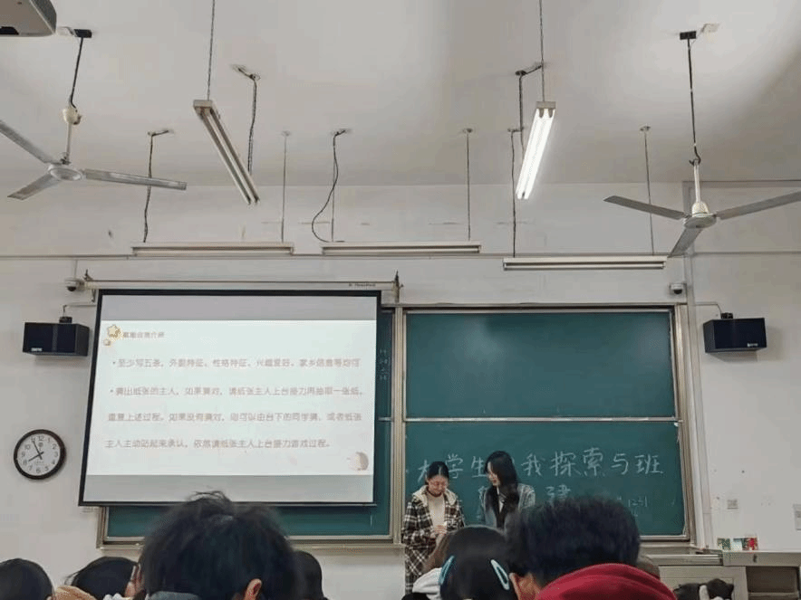 首先,学班介绍班会主题,讲述游戏流程与规则,鼓励同学们积极参与游戏,活跃班级氛围。接着进行了第一个游戏——“赋能自我介绍”。同学们在纸上写五条个人信息,由台上的同学根据信息猜纸条主人。同学们从外貌特征、性格特征、兴趣爱好、家乡信息等方面写下了自己的信息。在游戏过程中,同学们的描述引的大家不由发笑,有说自己相貌车见车爆胎的,有说自己爱看帅哥美女的,也有说梦想变成超级有钱的人。同学们以各种方式表现自己,有集社恐与活泼为一体的,有会各种球类的。在写个人信息的同时,同学们加强了对自我的进一步探索。而在猜名字的过程中,同学们分享彼此的经历、爱好和兴趣,也加深彼此之间的了解和认同。