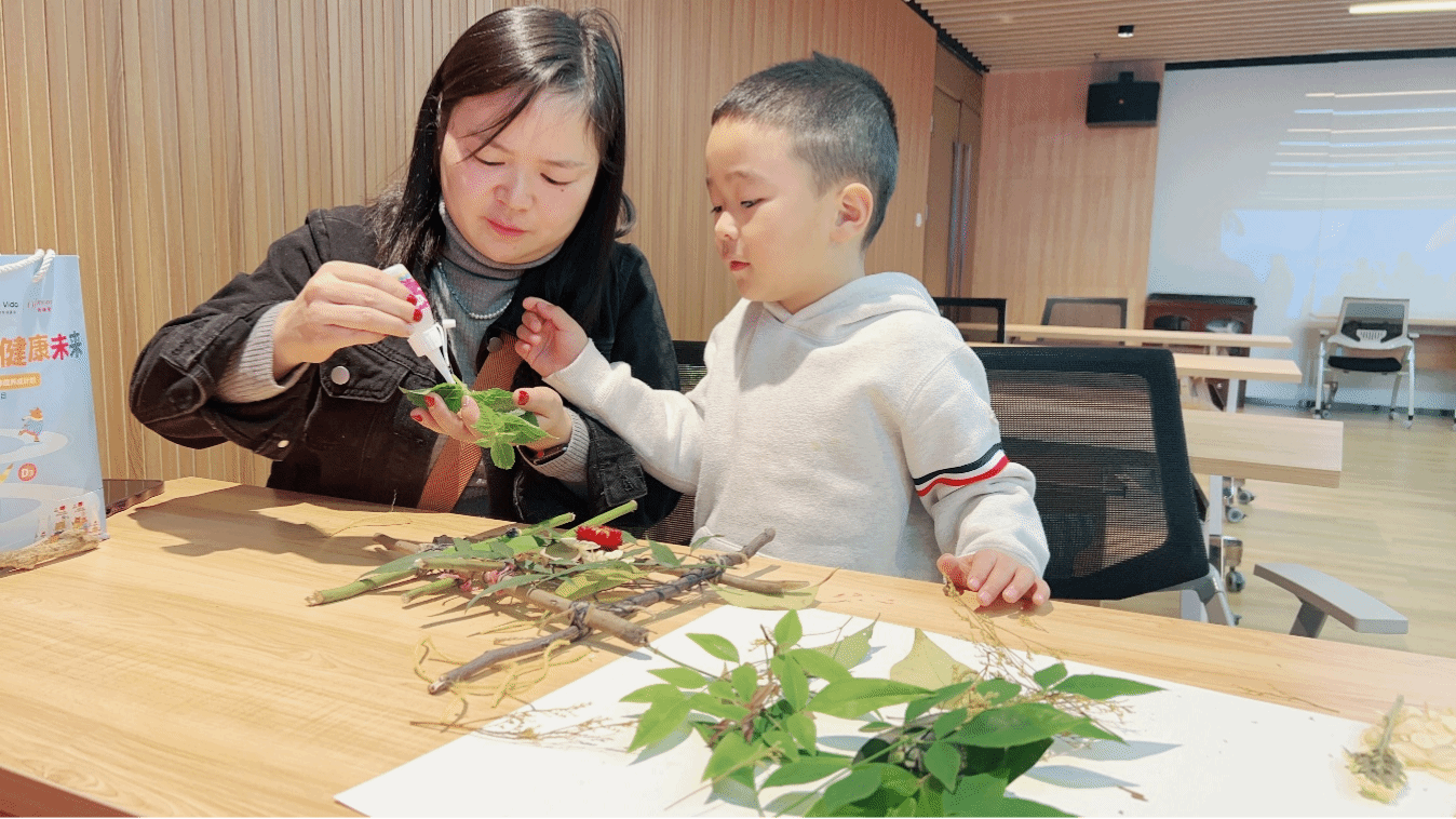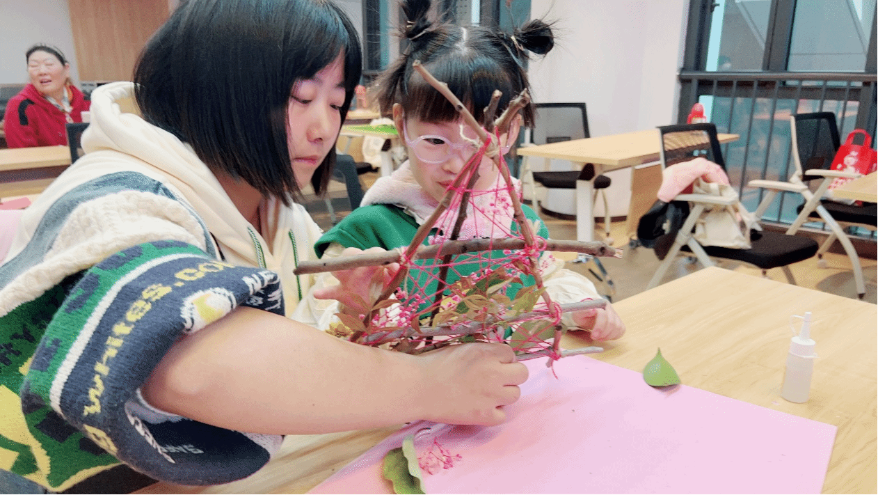 在我院团总支书记陈军老师的带领下,活动正式开始。家长与孩子们相继落座,志愿者讲师也通过讲述编织的历史渊源,带领孩子们走进编织的世界,而后通过一系列的图片让孩子们了解编织的种类,打开孩子们的好奇心。为了让孩子们更好的体验编织,志愿者们分发了他们从大自然中带来的材料给孩子们,树枝、落叶、花朵等等。在陈军老师与志愿者讲师的帮助下,孩子们与家长们互相协作,将树枝用绳子串联起来,形成了一个个编织框,而后孩子们开始自主发挥,一片片落叶,一朵朵花朵被放置在编织框之中,孩子们发挥着自己的想象,动手做出了一个个美丽的自然相框。在制作手工的过程中,孩子们会更加仔细地观察树叶的细节,欣赏它们的美丽之处,并将这些美丽的元素融入到手工作品中。通过手工,大家能够更加深入地了解和感受大自然,进一步培养对自然的热爱和保护意识。一片小小的树叶、一根不起眼的树枝,这些随处可见的材料也能做出如此有创意的作品,小朋友们意犹未尽,高喊着回家还要再做一个更漂亮的相框出来。在相互间的合作中,孩子们体会到了编织的乐趣,既培养了自己的动手能力,也让孩子们对大自然的美认识更深。