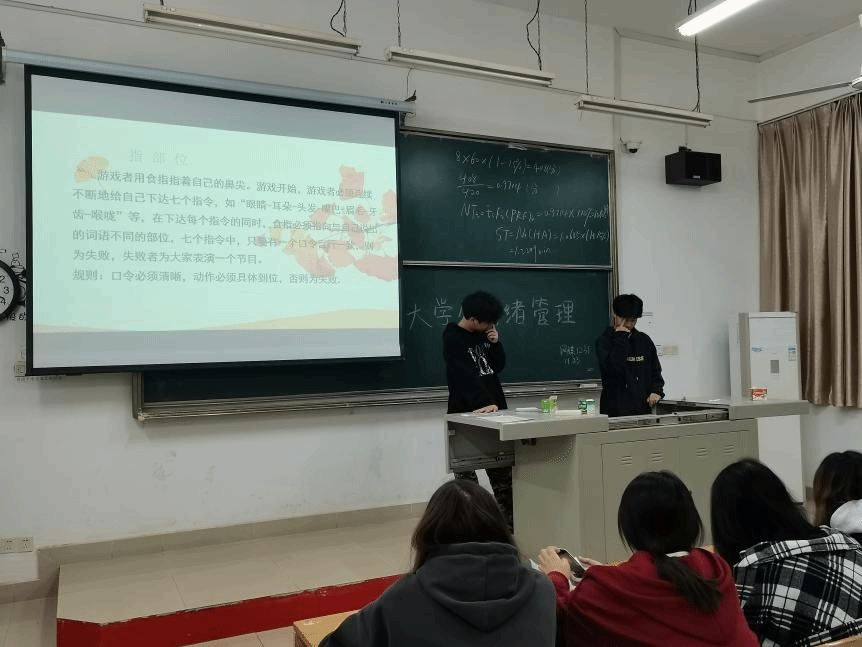 首先,学班以“指部位”的小游戏引入情绪管理的主题。在游戏中,同学们必须连续不断地给自己下达七个指令,在下达每个指令的同时,食指必须指向与指令词语不同的部位。同学们先自行预演一番,而后学班挑选两组现场展示。陈轩同学与杨佳祥语言和动作稍显迟钝,且都在指到眉毛的时候快速失败。失败后同学有些懊恼,强烈要求再试一次。而王子赫同学上台后较冷静,十分迅速又完美的结束了游戏。该游戏充分展示了同学们对一件事情不同的情绪表现,也让大家理解了情绪不同所产生结果的差异。