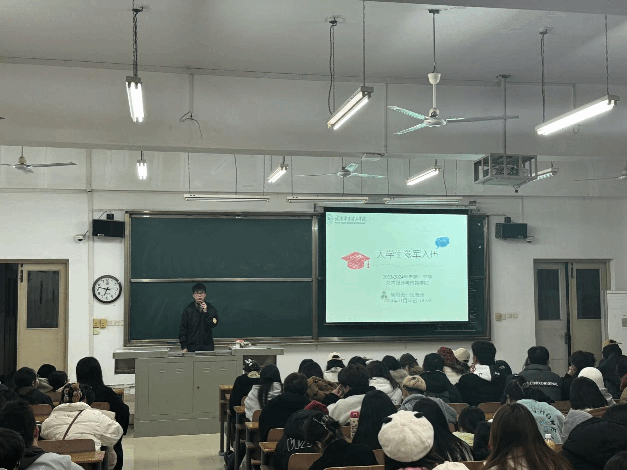 为了响应国家的号召,让更多的大学生了解并参与到入伍报名的行列中。11月29日,21级广告、视传全体学生于教学楼2-201开展了一场征兵动员宣讲会。本次宣讲会由辅导员张浩琦主讲。