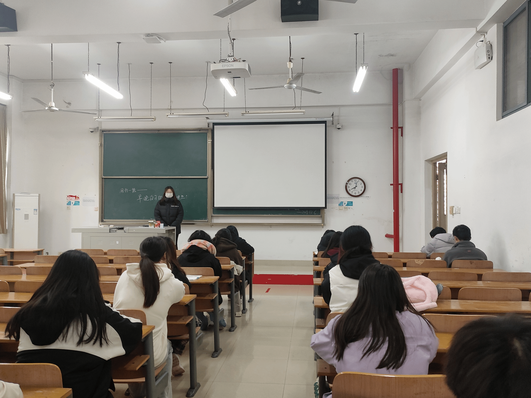 两人从不同角度来表述了她们对早晚自习的看法,通过两人的分享,同学们也了解到早晚自习的意义是什么,同两位分享的同学积极交流话题。班长胡曦文鼓励同学们按时参与早晚自习,从而加强对自己的管理,提高学习效率,保持学习积极性。