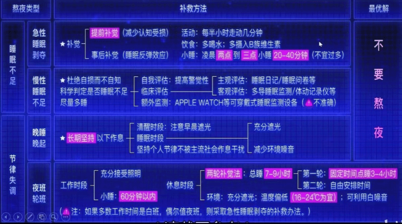 为了帮助同学们更好地自救,辅导员着重向大家介绍了不同类型熬夜的解决办法和熬夜后的补救方式。通用方法是寻找代替熬夜的“积极补偿”;增加白天的自我关照行为和愉悦体验;不带电子产品上床。
