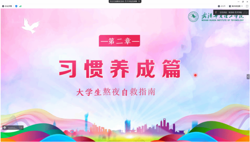 为促进学生身心健康发展,养成良好的作息习惯。12月10日,21级广告、视传全体成员于腾讯会议学习了“熬夜自救指南”,辅导员张浩琦带同学们深入了解了熬夜的危害以及如何进行熬夜自救。