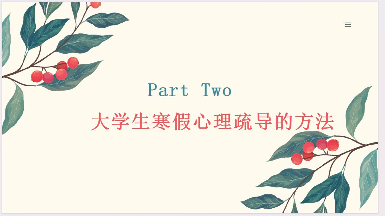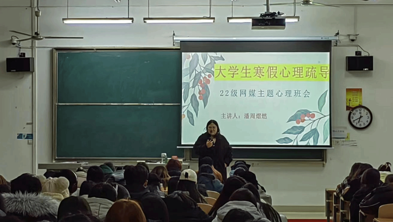 健康寒假,从“心”开始,假期的列车如期而至。一个轻松愉快的寒假具有健身、健心、健脑,缓解精神和心理紧张的作用,但是,对于一部分学生来说,他们的寒假未必能获得快乐的体验,可能因为与父母的沟通缺失,生活规律的紊乱等各种原因导致心理危机的产生。因此,22级网媒辅导员潘周熠燃于1月4日在2-108开展了“大学生寒假心理疏导”主题班会。