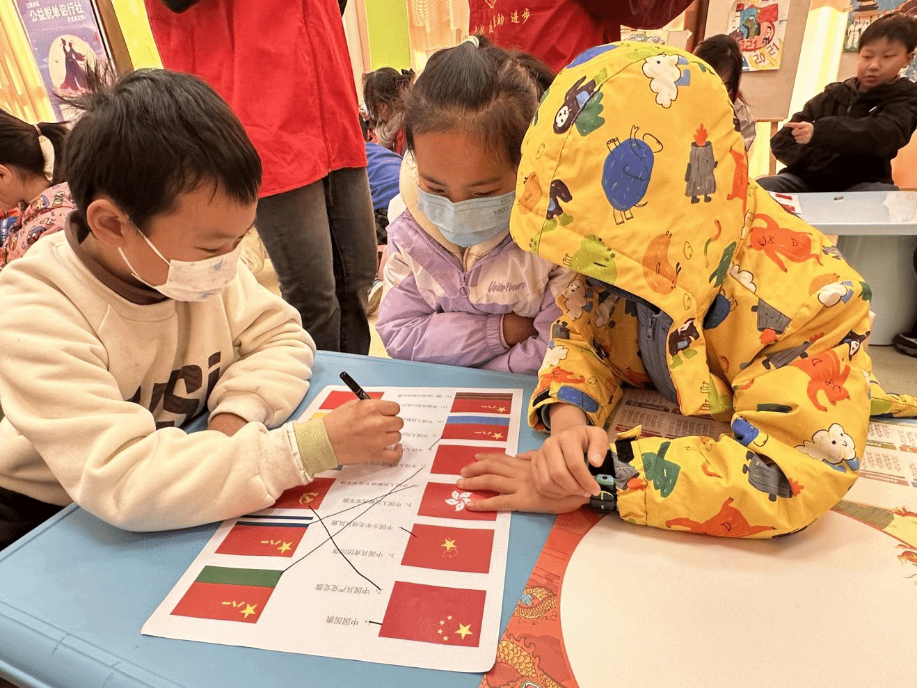 同时,志愿者们会教着小朋友们去认识没见过的旗帜,例如“八一旗帜”等等。最后的一项任务就是“重走长征路”大比拼。对照着地图,志愿者给小朋友们讲解着关于长征的故事。安静地听着这些故事,小朋友会时不时和志愿者们相互交流。大比拼过程中,小朋友们积极和志愿者们沟通、互动,他们学习着、欢笑着,现场气氛非常融洽。完成大比拼任务后,志愿者们向小朋友们进行了党史知识的总结,本次活动宣告结束,志愿者和小朋友们进行了最后的合影留念。