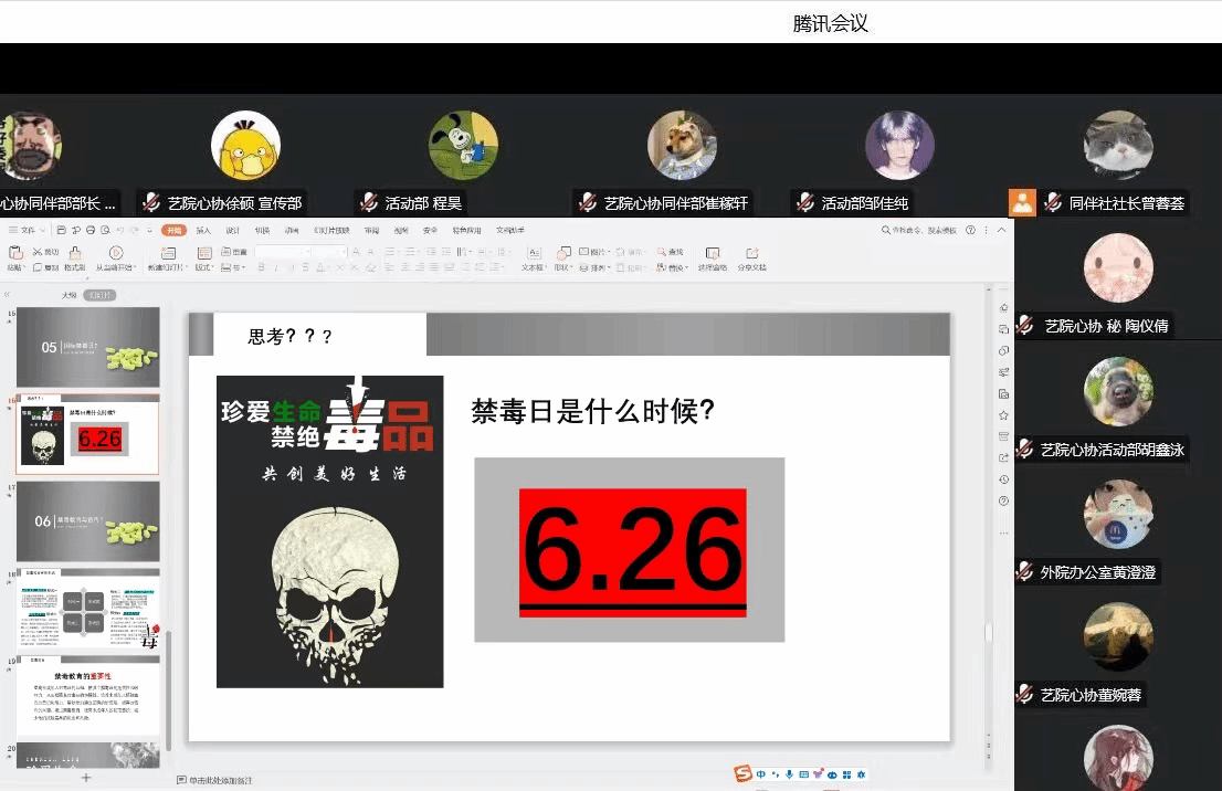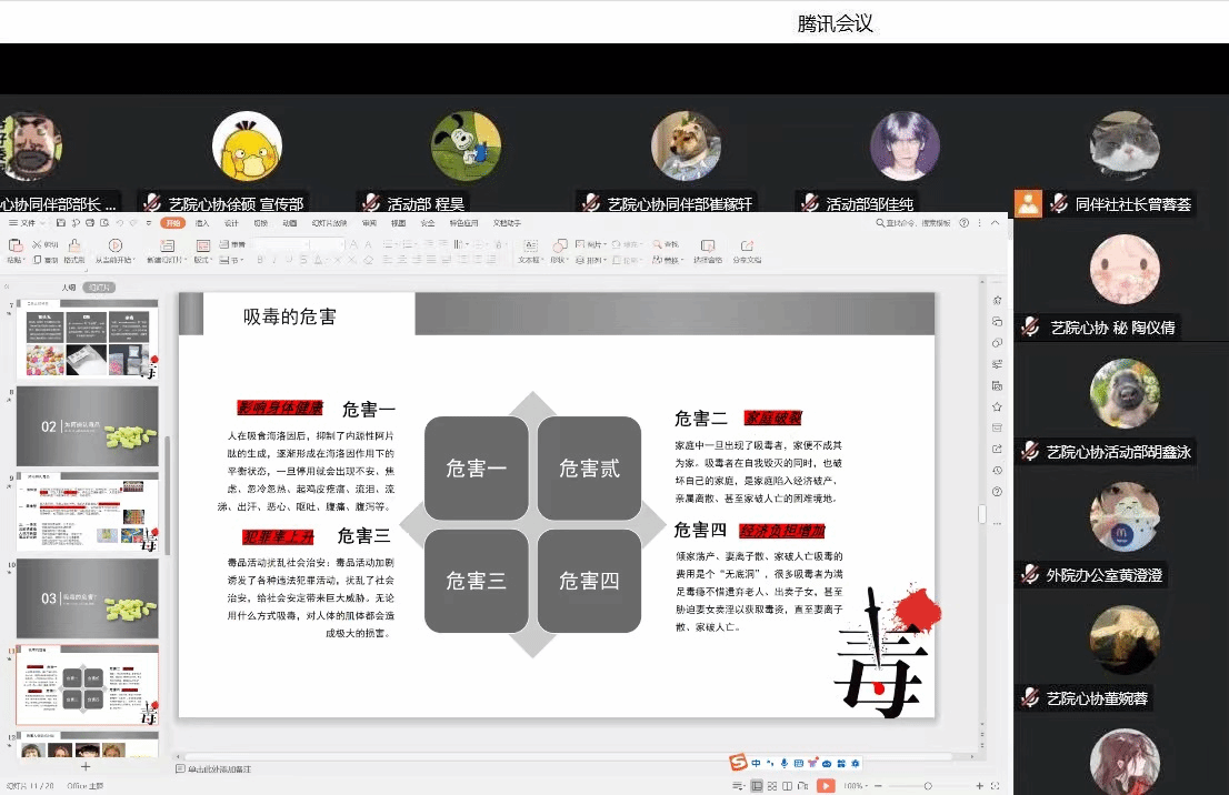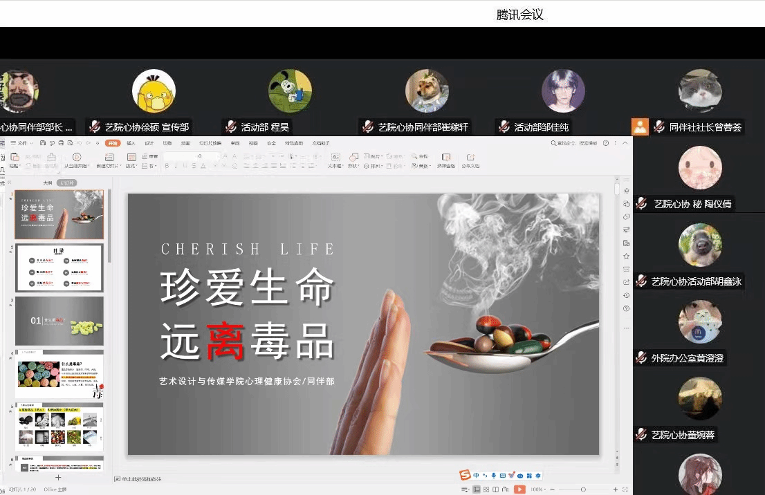 为进一步创设良好育人环境,增强师生的禁毒意识,使同学们了解毒品给人类带来的危害,进一步提高师生对毒品工作重要性的认识,营造良好的校园禁毒氛围。2023年1月12日晚上6:30分,艺术设计与传媒学院心理健康协会召开了“禁毒教育”线上主题会议,心理健康协会全体成员共同参与,会长李露杰主持了本次会议。