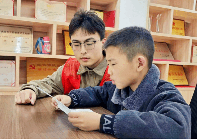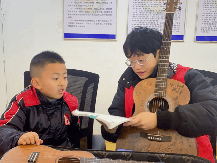 首先,在小朋友们相继落座后,志愿者们讲述了红歌的历史。源远流长的红歌,使小朋友们对红歌的历史印象变得清晰而又深刻。志愿者们给参加活动的小朋友们每人发了一张《我和我的祖国》歌词表,小朋友们唱《我和我的祖国》具有深远的意义与价值。随后,志愿者们教小朋友们学习吉他等乐器,小朋友们对新事物怀有巨大的热情,聚精会神的听着,不一会儿就慢慢的尝试弹唱。