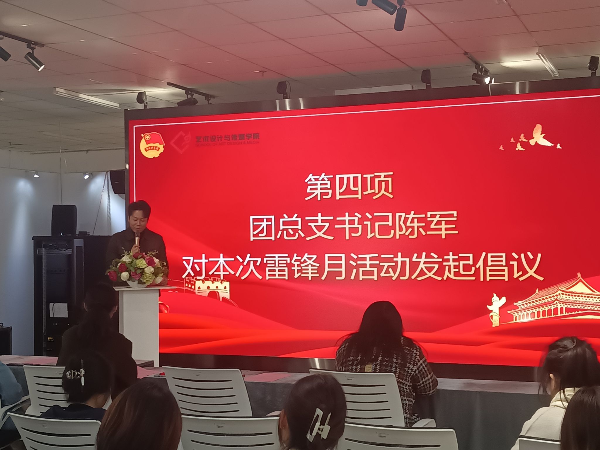 紧接着,团总支书记陈军老师上台对本次雷锋月活动发起倡议,他以自己参与志愿服务项目十二年经验为谈,倡议同学们积极投身多领域多方面,把自己崇高的理想信念和道德品质追求融入日常的学习生活,让青春在实践中绽放绚丽之花。