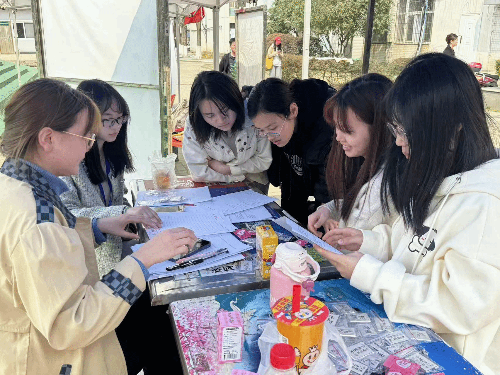 在活动开始前,志愿者们早早的到达现场,对选定的位置进行场地布置,迎接同学们的到来。参与者通过回答与消费者维权知识相关的问题,可获得小礼品,如:兔子灯、积木、钥匙扣以及盲袋,答对不同的数量的题目会获得相应地礼物。这项活动不仅可以调动同学们的参与性,同时增强消费者对自我权益保护的认识。