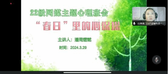 春天是充满活力,以及各种可能性的季节,同时,春季也是情绪问题“抑郁症”的高发季。为了让同学们美好享受春天,品味生命美好。3月29日,22级网媒全体同学在辅导员潘周熠燃的带领下,于线上开展“春日里心保操”主题心理班会。
