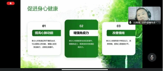 在会议的初始阶段潘老师首先强调了心理健康的重要性。提出了心保操是一种通过简单的身体活动来增强心理健康的活动。然后,潘老师提到了由于春天是情绪波动较大的一个季节,同学们在面对繁忙的学习生活以及各种压力,容易引发抑郁症,焦虑症等心理问题。所以这就要求同学们要学会调整心态,保持积极向上的精神状态。最后,潘老师为同学们提供了一些具体活动示例,来帮助我们更好地调节情绪、释放心理压力。