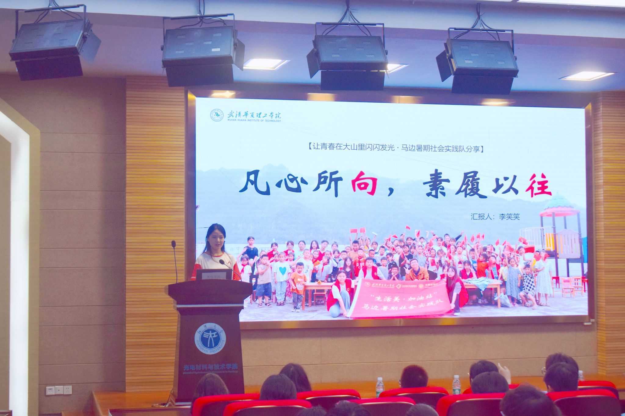 5月30日18时30分,江汉大学J13一楼报告厅内座无虚席,武汉华夏理工学院团总支书记陈军老师带领夏·关志愿服务团、星与薪火红色文化调研实践队、“生活美·加油站”马边暑期社会实践队三支优秀实践队,与江汉大学的师生们共同分享了他们在乡村振兴和社会实践中的所见所闻、所感所悟。