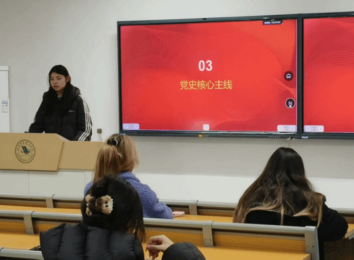 班会伊始,团支书以“百年风雨兼程,铸就世纪辉煌”为主题,带领同学们回顾中国共产党波澜壮阔的奋斗史诗。从嘉兴南湖的红船启航,到井冈山上的星火燎原;从万里长征的艰苦卓绝,到抗日战争的烽火岁月;从解放战争的胜利号角,到新中国建设的改天换地;从改革开放的春潮涌动,到新时代征程的砥砺前行——一帧帧珍贵的历史画面、一段段感人至深的英雄故事,生动再现了党领导全国各族人民实现从站起来、富起来到强起来的伟大飞跃。团支书动情地说道:“党的历史是一部用鲜血与生命写就的教科书。我们唯有铭记来路,才能珍惜当下,走好未来的路。”深情的讲述引发了全场同学的强烈共鸣。