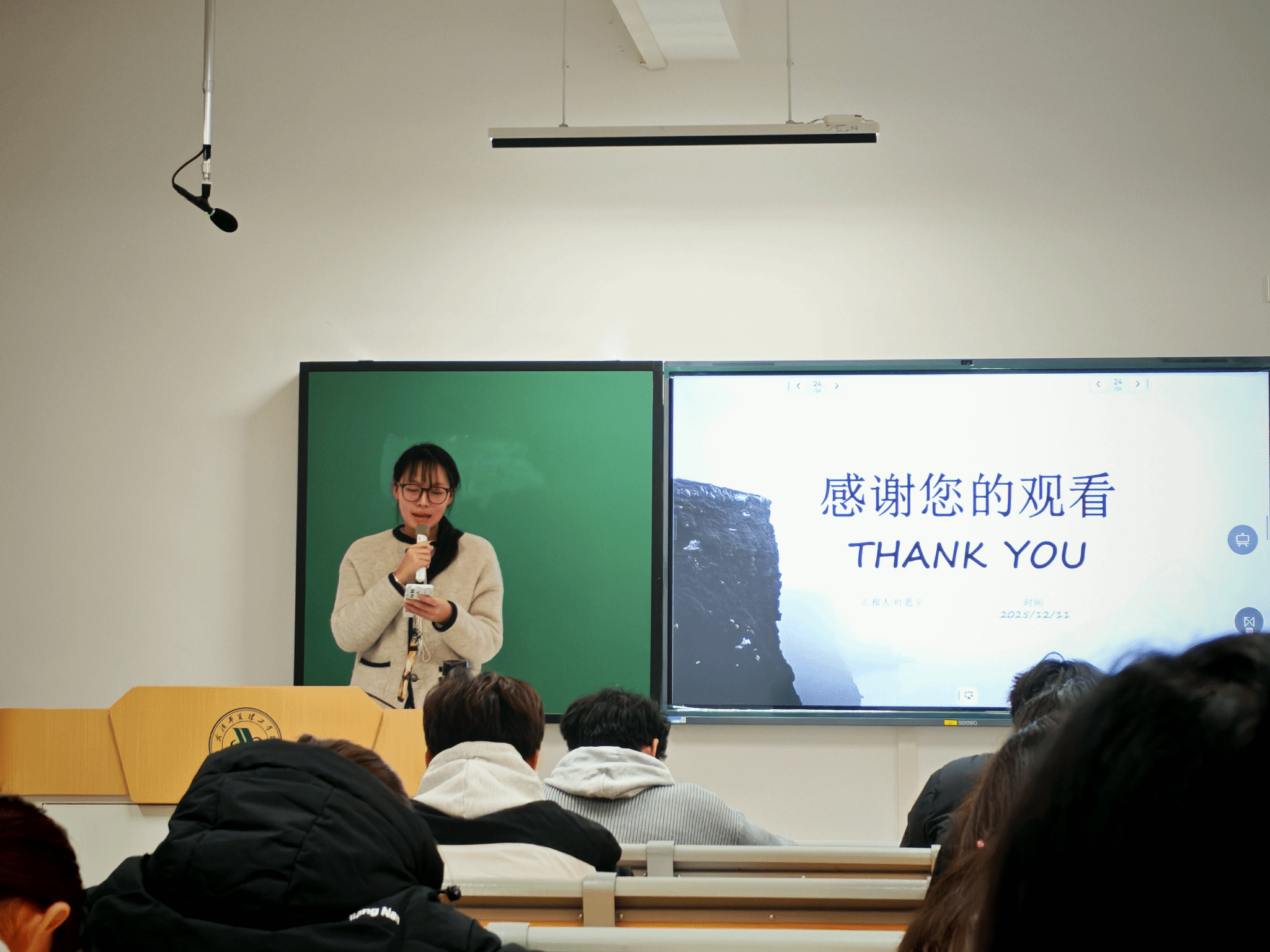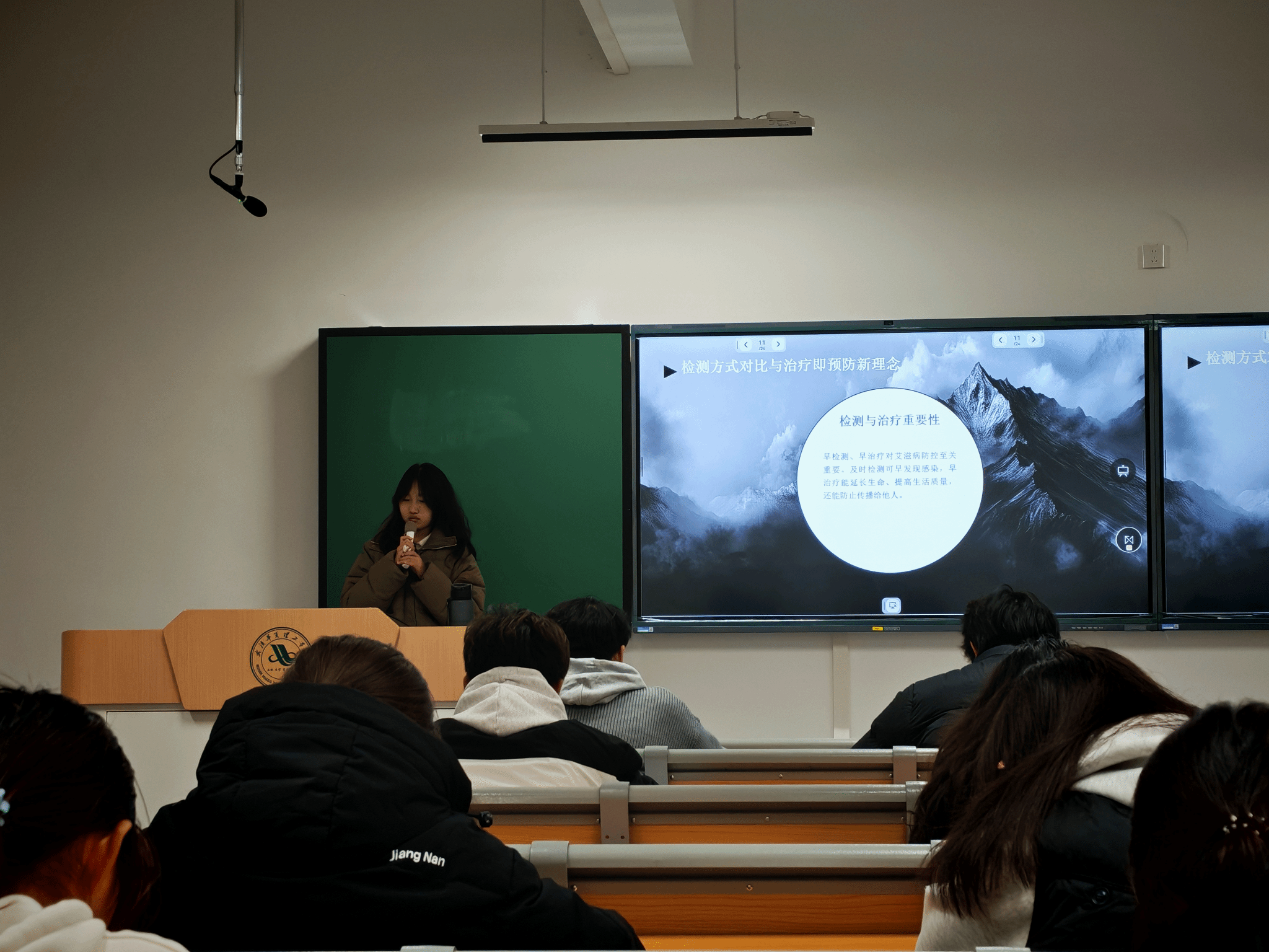 叶思宇同学通过PPT从艾滋病基础认知、传播路径误区拆解、科学干预进展等六个维度展开系统讲解。她先为同学们梳理了艾滋病的致病原理与临床特征,再通过数据和案例,详细地区分了艾滋病的主要传播途径与日常接触的安全边界。在“青年行动·校园健康责任”部分,叶思宇号召大家主动向身边人普及科学防艾理念。此外,叶思宇还设计了知识问答、资源速查等互动环节,让同学们不仅懂防护,更知道遇问题时该如何寻求帮助。