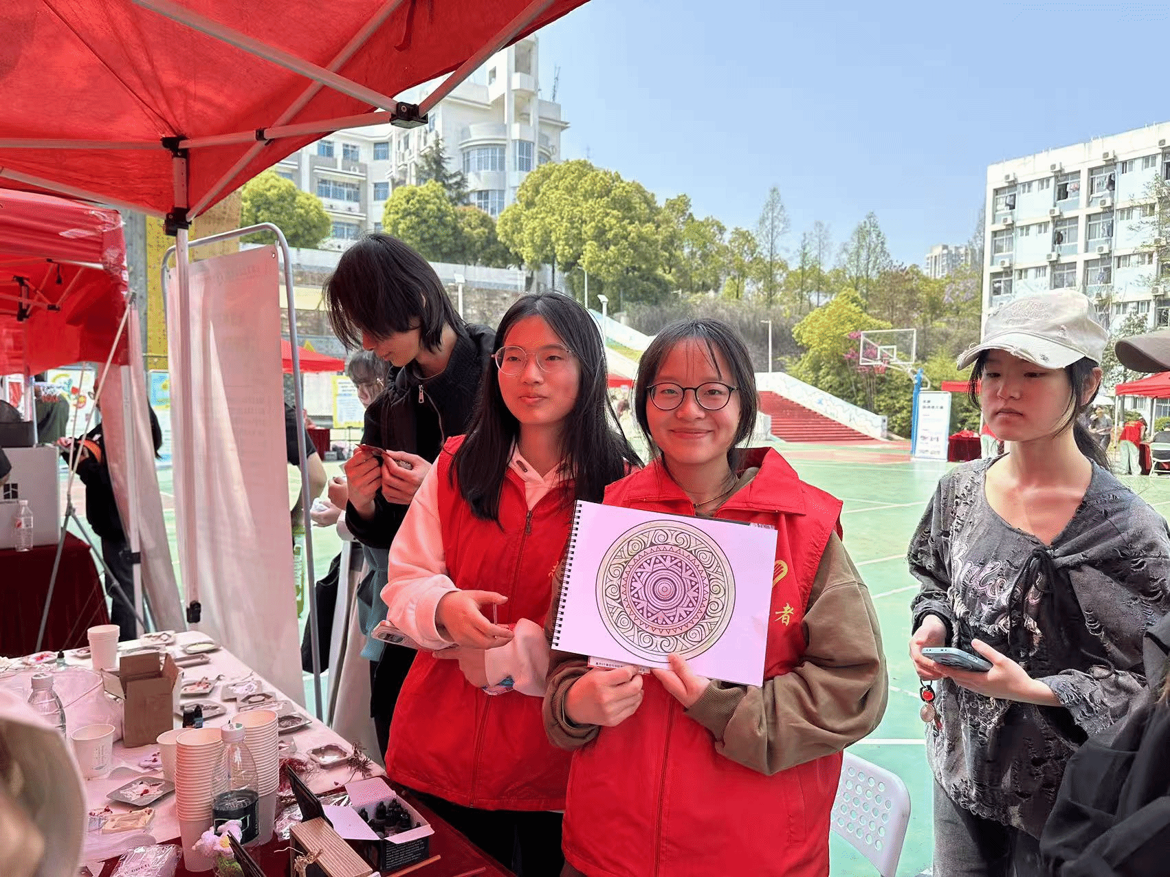 上午十时,市集正式拉开帷幕。艺术设计与传媒学院青年志愿者协会作为重要参与力量,精心策划了“非遗传承”“传统雅趣”“艺术疗愈”“公益科普”四大板块。非遗香薰拓片制作区,同学们亲手拓印花草,将芬芳与形态留存于纸笺;投壶体验区,欢声笑语中,传统礼仪焕发新生;涂色画画区,色彩斑斓的画布成为童真与想象的舞台。