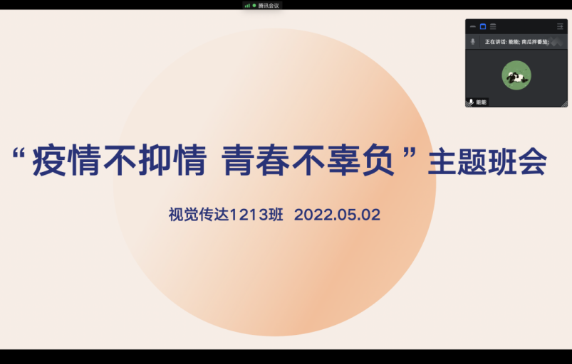 受疫情的影响,学校采取“非必要不出校门”的管理方式。面对当前防疫严峻的形势,为增强同学们的防疫意识,同时缓解其心理压力。5月2日晚8点,视觉传达设计1213班在线上召开“疫情不抑情,青春不辜负”主题班会。班会由导师班主任熊煜琳主持召开,视传1213班全体同学参加。