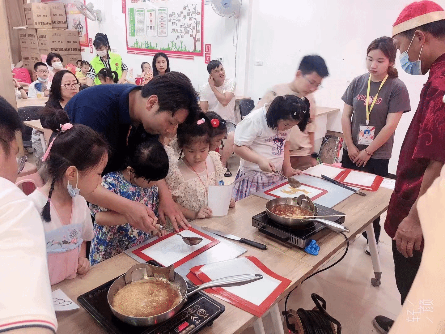聆听非遗历史,体验非遗技艺,品尝非遗糖画,体会别样的六一。2023年6月1日下午2:30,武汉华夏理工学院艺术设计与传媒学院团总支、华夏非遗实践队、学生会联合琴台社区居委会举办了一场“舌尖上的非遗”亲子活动。