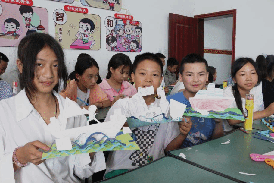 实践队队员们于上午十点准时开展相应的教学活动,并介绍本次课程安排,使同学们对接下来两周的课程有大致的了解,也将师生之间的距离进一步拉近。课程开始,由实践队队员带来第一堂课《梦想的船儿》,该课程是由外国语学院的陈明睿和艺术设计与传媒学院的李响共同打造完成,将艺术与外语融合教学,与梦想的主题挂钩,激发小学员们对未来生活的热爱。课堂上,学生们在陈老师的帮助和同学之间的相互鼓励下,走向讲台进行了英文的自我介绍。接着,陈老师提出问题,你的梦想是什么。孩子们也有各种各样的梦想,想当特种兵、想当舞蹈家、想当老师......小小的教室挤满了孩子们的梦想。随后,陈老师重点表述了梦想没有高低贵贱之分。这次课程主题——梦想的船,船寓意一帆风顺,是希望孩子们乘着理想的船在未来的海洋上乘风破浪,去奋斗、去拼搏。接着,由李老师教孩子们绘画船,从点、线到面,从外语到艺术,将孩子们梦想的船画出来,更具象化、立体化。
