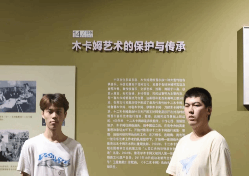 而后,实践队员马凡博为大家分享了新疆十二木卡姆展区。他分享道,新疆十二木卡姆是新疆地区的一种古老且极富特色的民间音乐舞蹈艺术形式,以其独特的韵律、优美的旋律和丰富的情感表达而闻名于世。这一千年古乐舞蹈的瑰丽之花,不仅是新疆各民族文化交融的见证,更是世界音乐史上的璀璨瑰宝。400年来,十二木卡姆都是师徒相传、口传心授。除了音乐、舞蹈之外,十二木卡姆还包含了丰富的诗歌和民间故事。这些诗歌和故事,以其深厚的文化内涵和独特的艺术韵味,传达了新疆各民族的历史、信仰、传统习俗和民间智慧。如“切哈尔”曲目中的“阿什奎丽·斯坎德尔汗”,便是一首描绘古代英雄斯坎德尔汗的英勇事迹的史诗,展现了新疆各民族英勇善战的精神品格。
